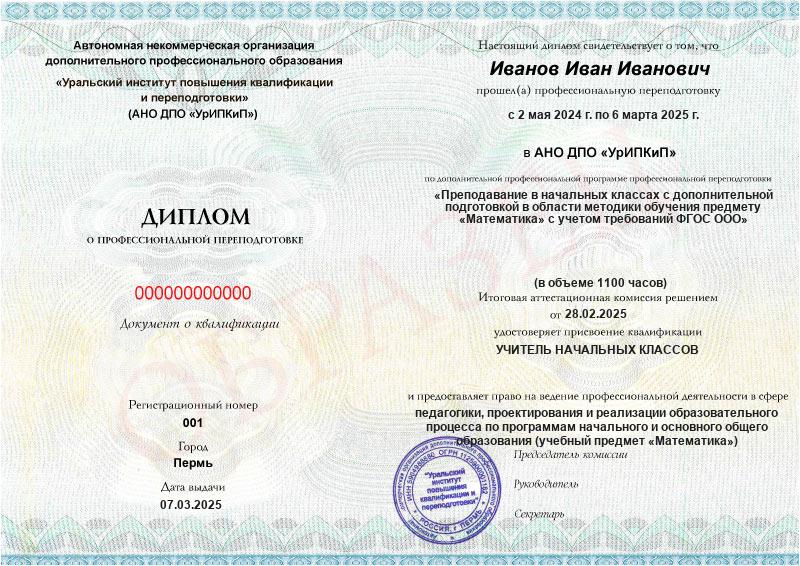 В таких условиях учитель должен обладать рядом профессиональных компетенций, овладеть которыми можно в ходе изучения дисциплин данной образовательной программы. После сдачи итогового тестирования вам будет вручен диплом установленного образца и присвоена квалификация «Учитель начальных классов», закреплённая в едином квалификационном справочнике. Кроме того, вы изучите технологию преподавания математики в условиях функционирования ФГОС ООО, в результате чего сможете хорошо ориентироваться в многообразии математических терминов и понятий, доступно объяснять учебный материал и показывать возможности практического применения математических знаний.