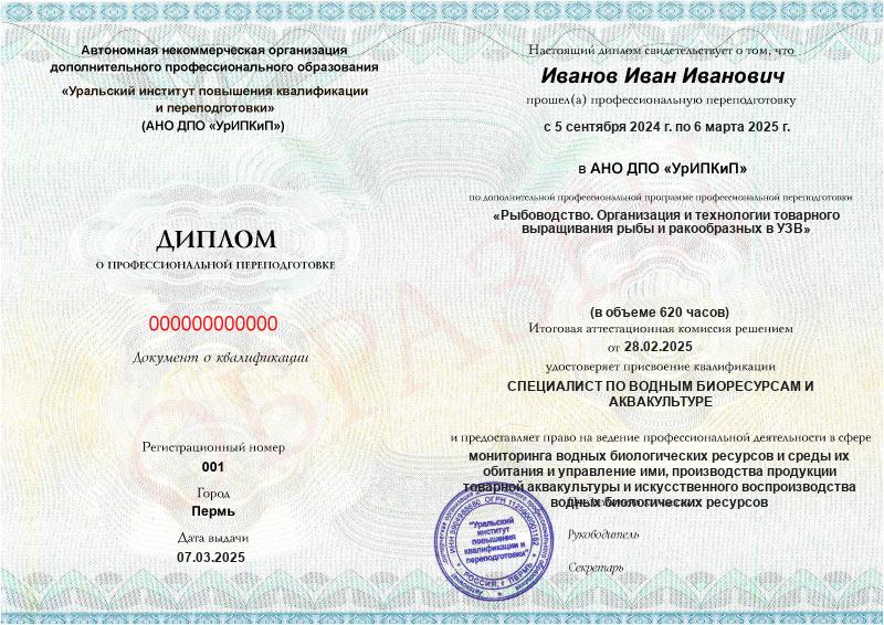 • Диплом о профессиональной переподготовке с присвоением квалификации «Рыбовод». Вносится в Федеральный реестр документов об образовании.