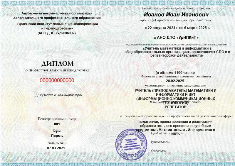 - 2 квалификации: Учитель (преподаватель) математики и информатики и икт (информационно-коммуникационных технологий) + Репетитор